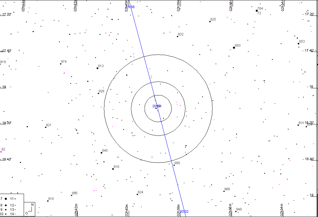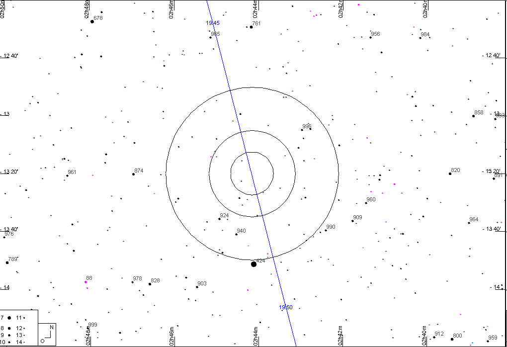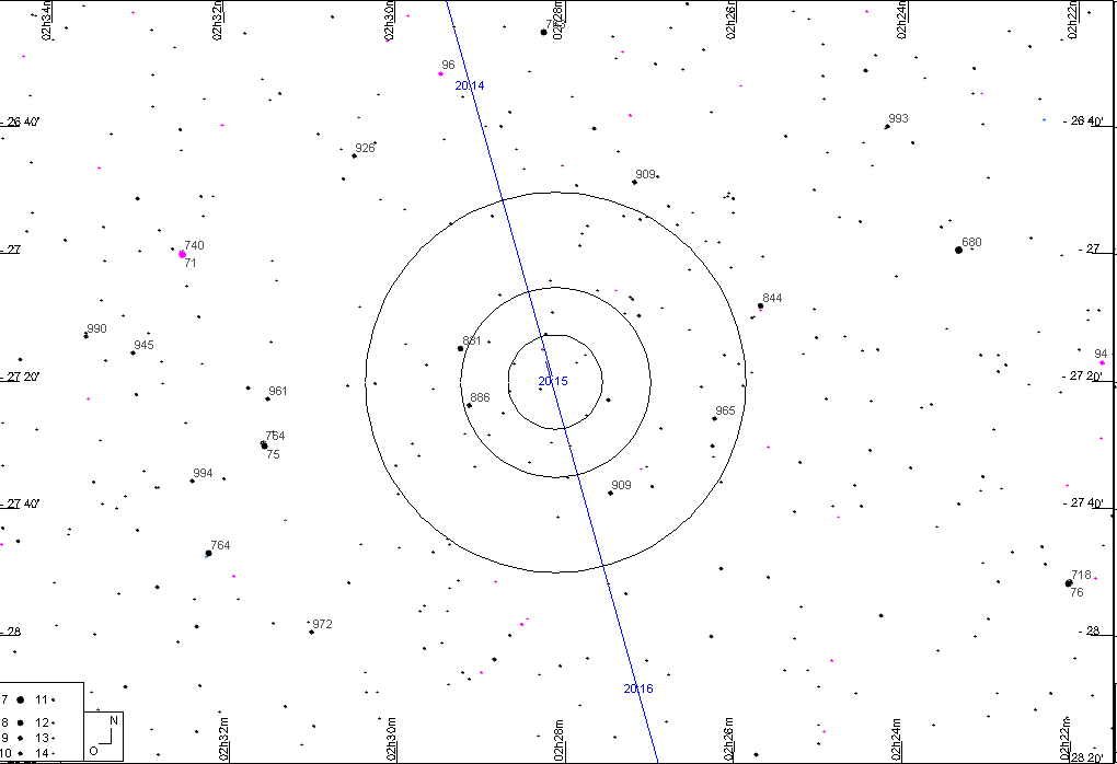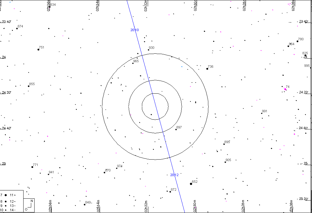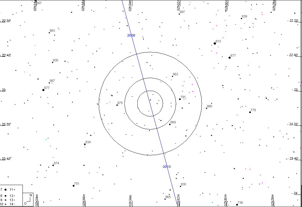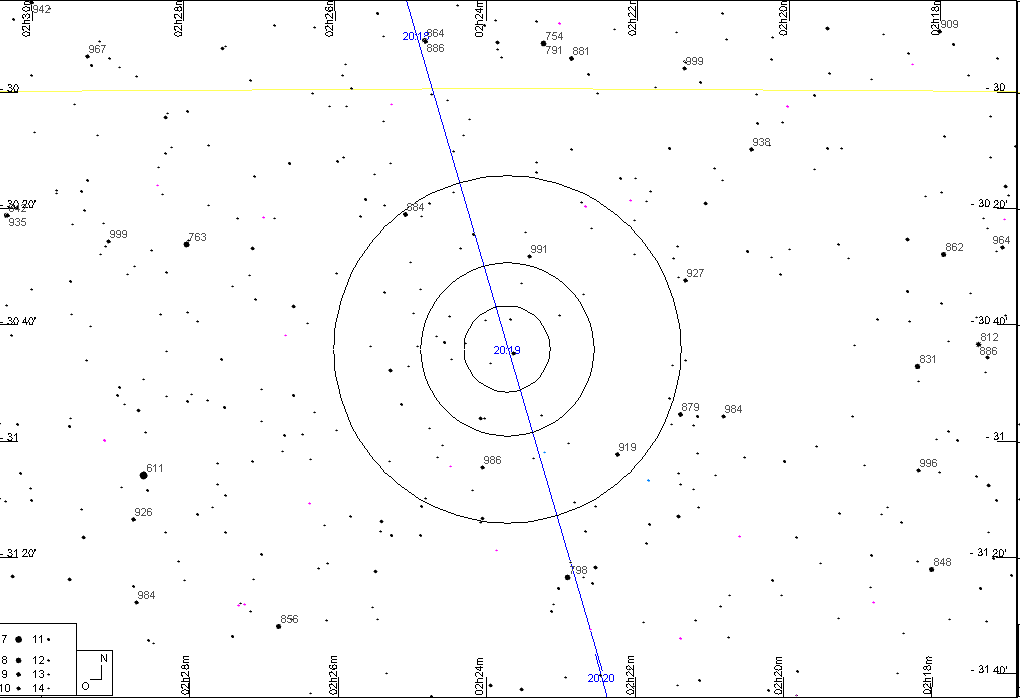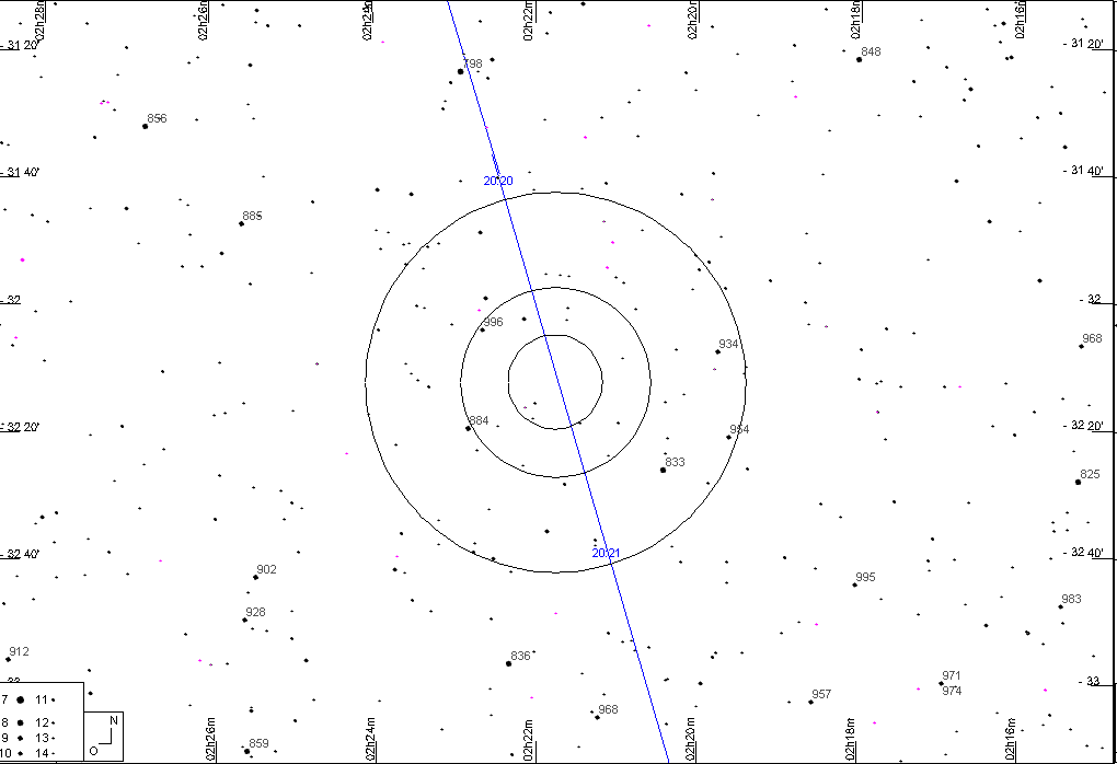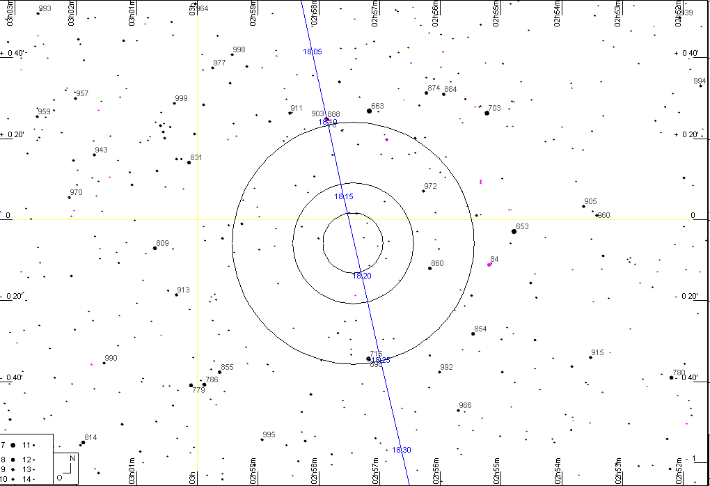 Bei den detailierten Bahngrafiken sind jeweils Sterne bis +10mag mit einer Helligkeitsangabe beschriftet und Sterne bis zu einer Grenzhelligkeit von +14mag in der Karte dargestellt.