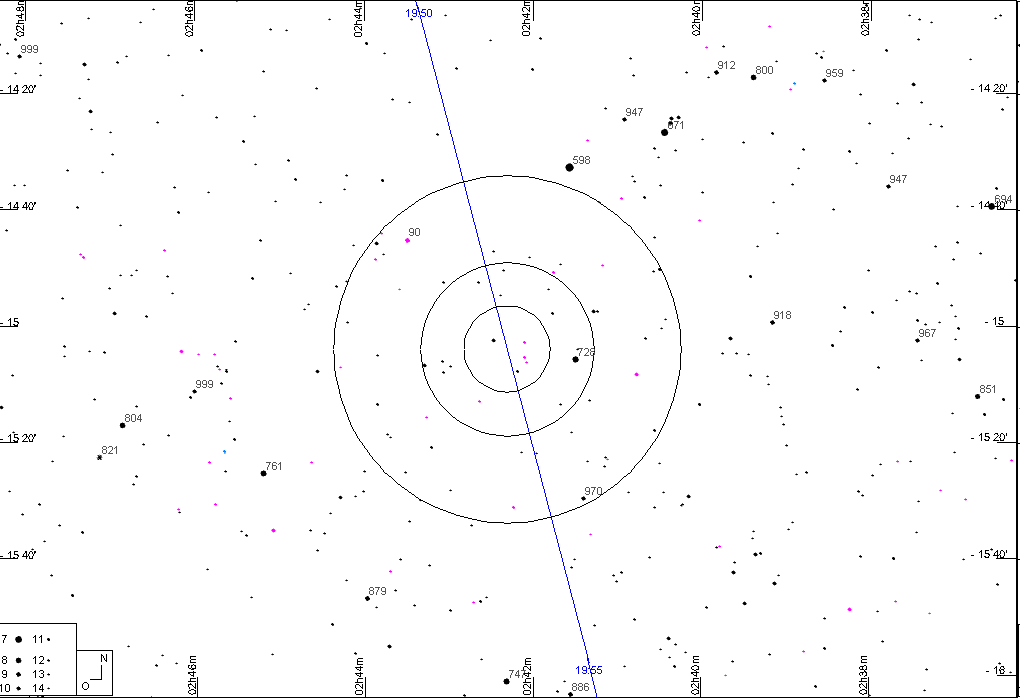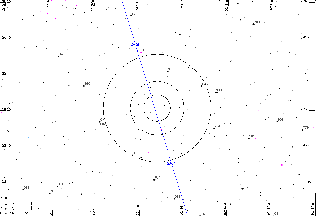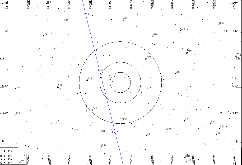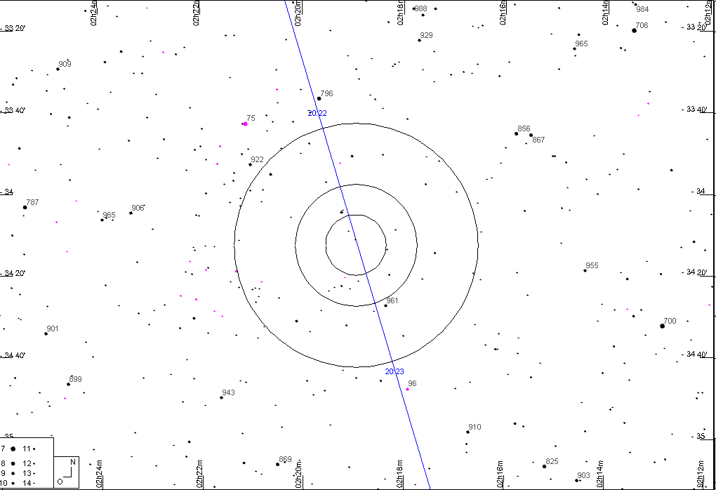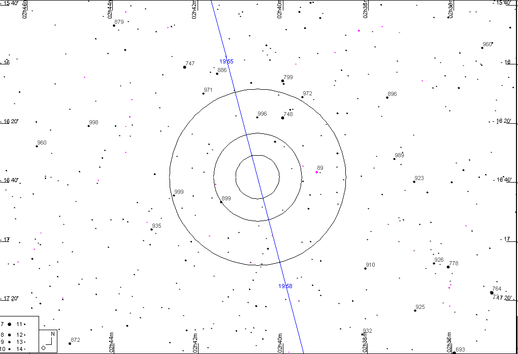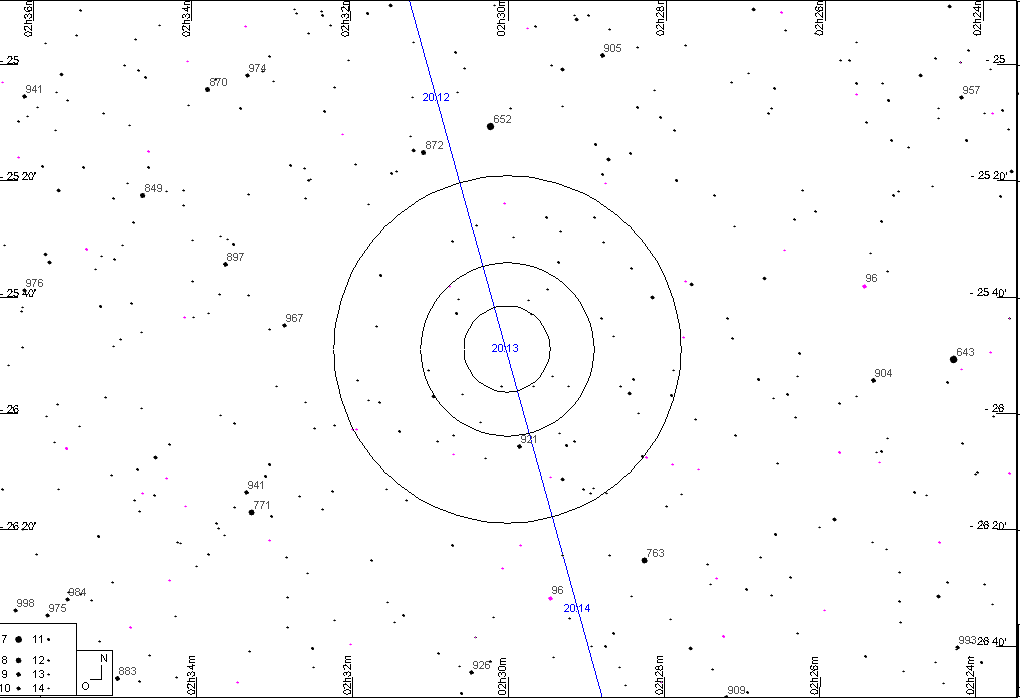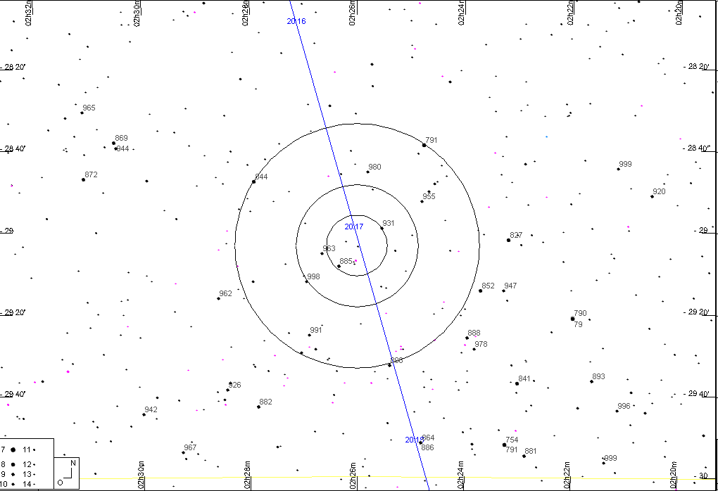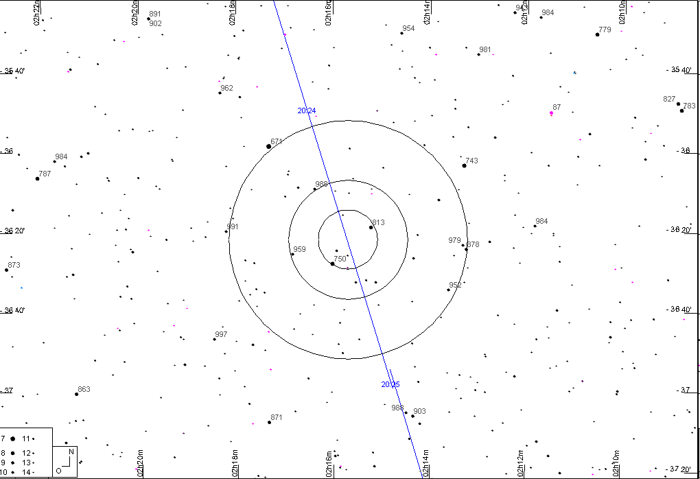 Bei den detailierten Bahngrafiken sind jeweils Sterne bis +10mag mit einer Helligkeitsangabe beschriftet und Sterne bis zu einer Grenzhelligkeit von +14mag in der Karte dargestellt.